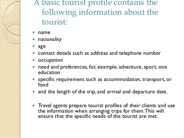 Tourist Profile Example : Itinerary Preparation And Tour Costing Dokterandalan. A basic tourist profile contains the following information about the tourist: These cities were selected for their rich cultural heritage and change in volume of tourism in recent years. These are tourists who go to other countries to get medical treatment that is not provided in russia or which level there is lower than in a country of destination. However, before a tourist can be called as such, there is a long way to go. The products of tourism cannot be easily standardized as they are created for the customers of varied interests and demands.
